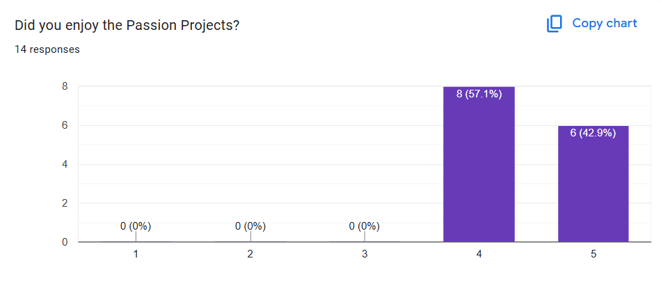 4: “I chose four because it was a fun experienc but I wish we had more help from faculty’s to assist in the passion project.”